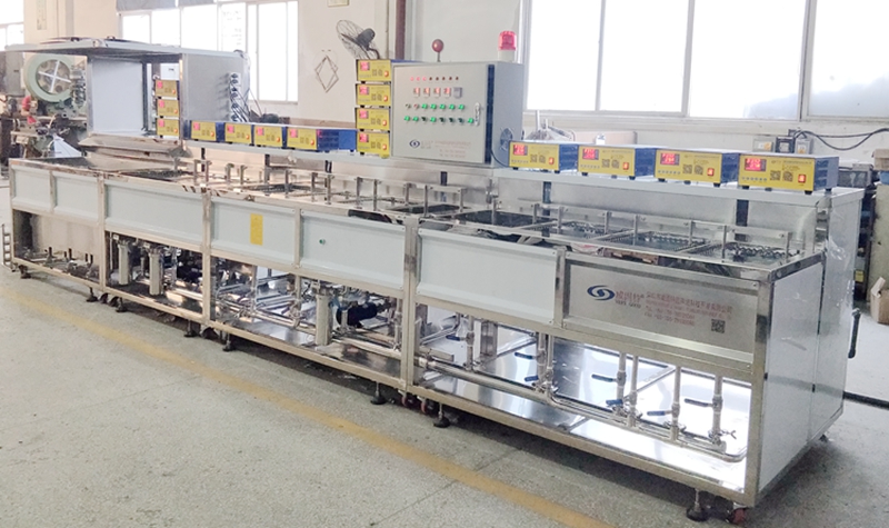 結構構成:該清洗機主要由超聲波發生器、換能器、清洗槽、脫水槽、儲液槽、循環過濾系統、自動恒溫加熱系統、拋動系統、抽氣罩、冷水機、機架、電控柜等組成。