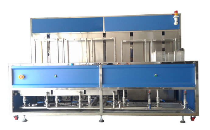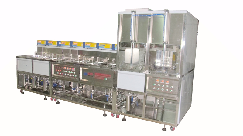 該清洗機(jī)是 9 個(gè)由不銹鋼材質(zhì)制作的洗劑超聲槽、強(qiáng)堿超聲槽、市水/回用純水超聲槽、純水超聲槽等組成的一條連續(xù)工作的由清洗的裝置。